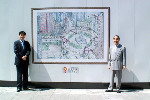 引き続いて柳川ロータリーへ移動して、白い仮囲いをカンバスに展示された4枚のパネルの除幕式が行われました。展示されているのは、一般の部、児童生徒の部の最優秀作と優秀作4点です。当日出席した津下幸大君と阿部理花子さんが自分の作品の前で、ご家族や小嶋社長、守安学芸課長、浦辺設計松村社長らと記念撮影をしました。
